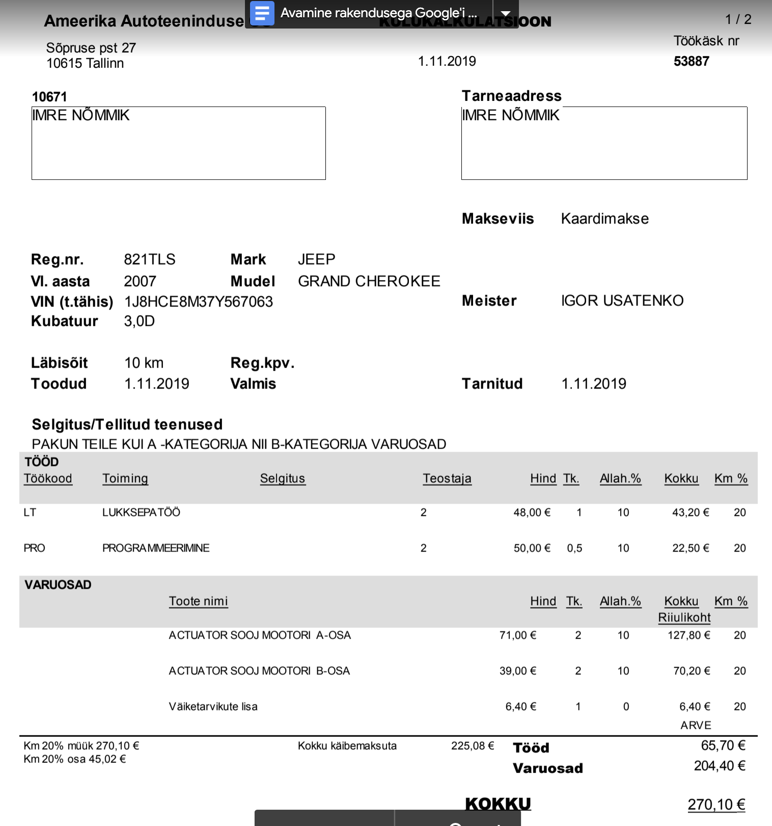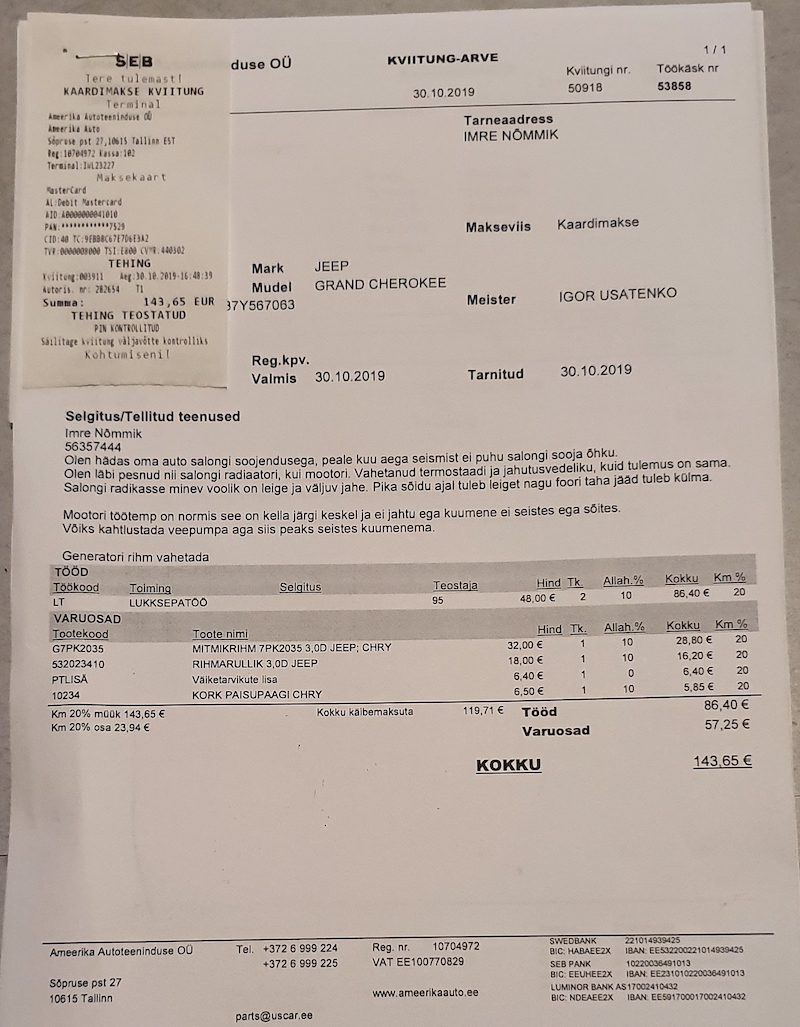 Eelmine kolmapäev 31.10.2019 oli mu auto Ameerika autos inspekteerimisel, ja palusin veepumba ja rihma vahetada. Rihm ja rullik vahetati kuid veepumpa mitte, väideti et sooja mitte andmise põhjus ei ole veepumbas vaid soojenduse aktuaatori mootorites või siis umbes salongi radiaator.