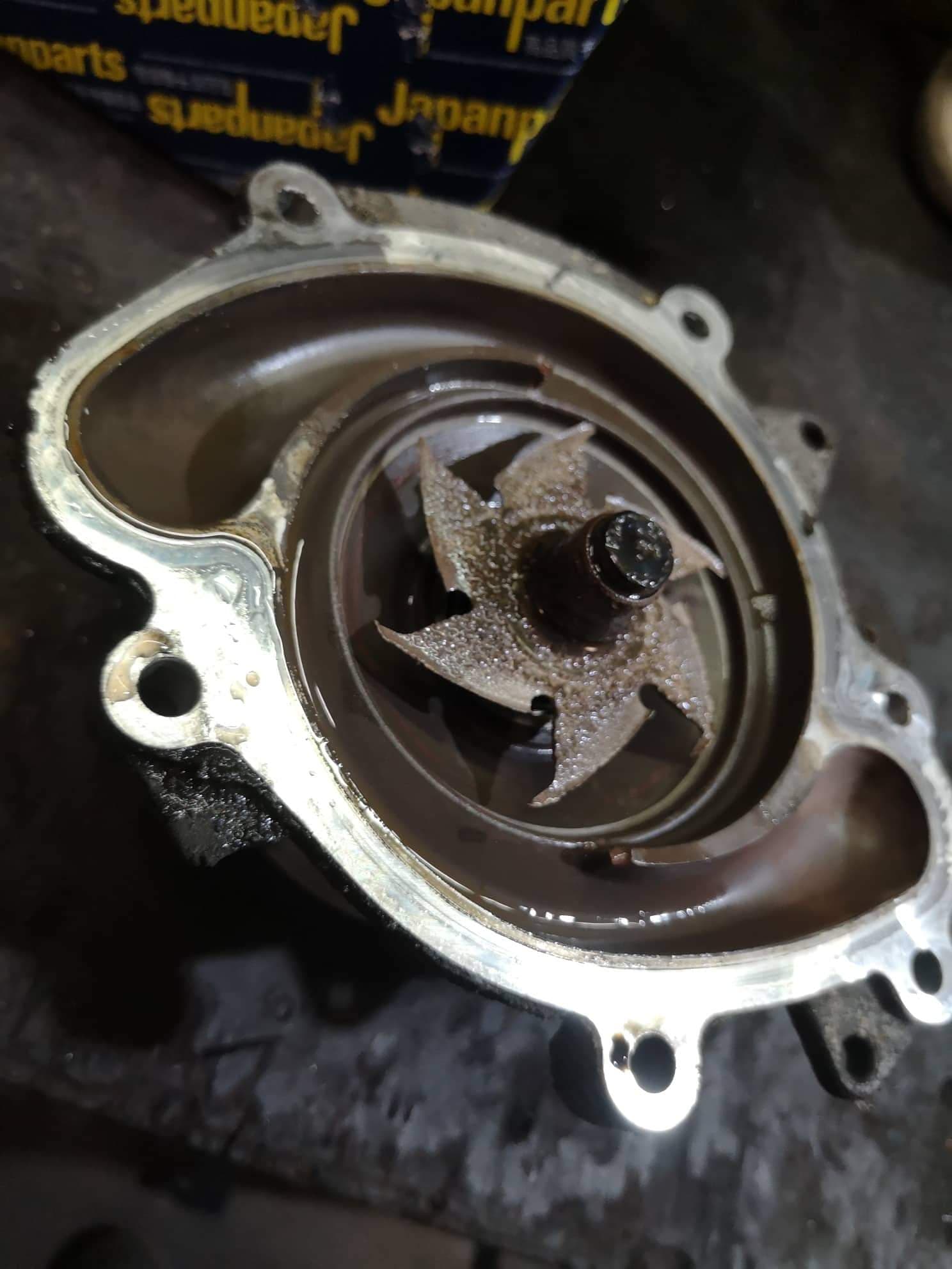 Täna käis auto tuttava juures kes leidis aega veepumpa vahetada ja mis seal siis leidus. Pumba rootor näeb välja kui trimmeri pea, kuhu aga kadunud osad on saanud? ilmselt ära jahvatatud.
